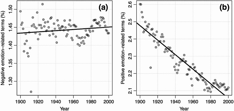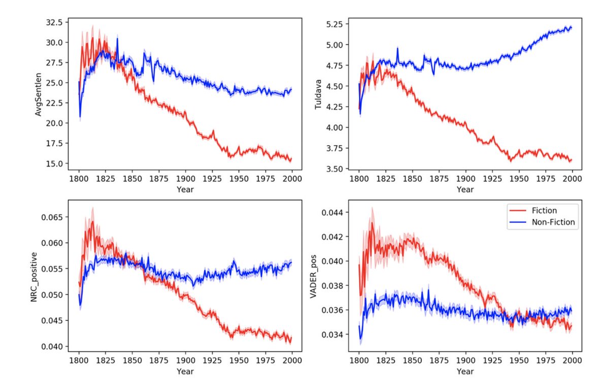 New metadata-rich dataset of English-language prose from 1800-2000. Clear decrease of positive emotions in fiction (red lines in the plot below). H/T