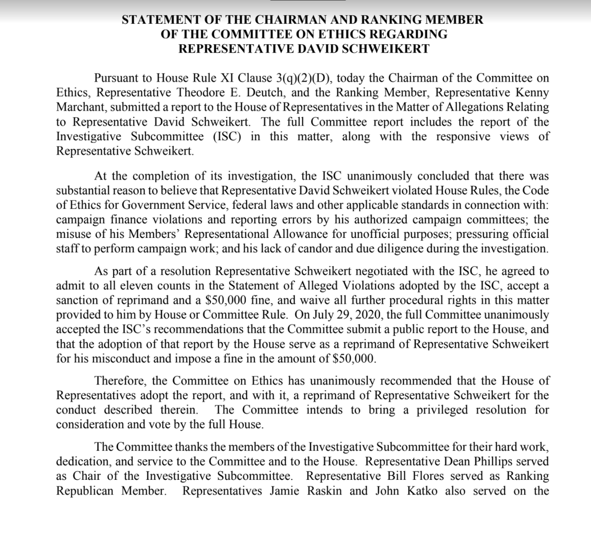 As part of a resolution Schweikert negotiated with the ISC, he agreed to admit to all eleven counts in the Statement of Alleged Violations adopted by the ISC, accept a sanction of reprimand and a $50,000 fine, and waive all further procedural rights in this matter...