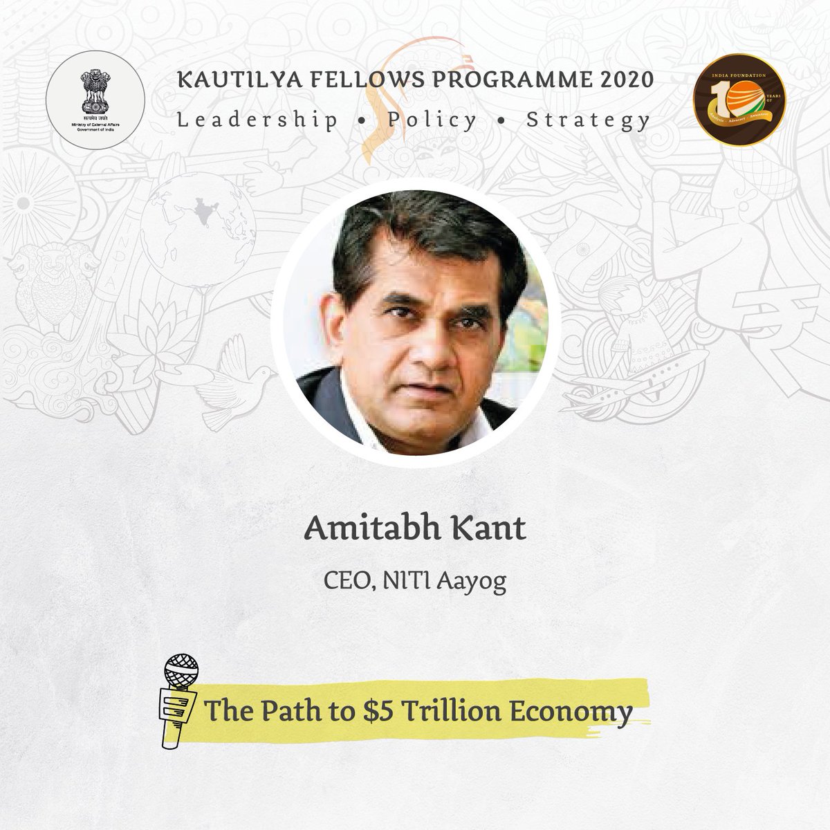 @amitabhk87), CEO@NITIAayog, will deliver a Lecture on "The Path to $5 Trillion Economy" in the Public Policy Module of the Kautilya Fellows Programme KFP 2020 organised by India Foundation.#KFP2020pic.twitter.com/TUvGH2STau