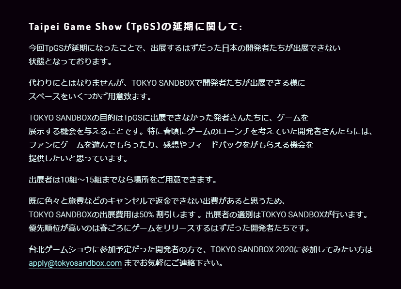Tokyo Sandbox conf. offering spaces to devs that were planning to exhibit at the cancelled Taipei Game Show