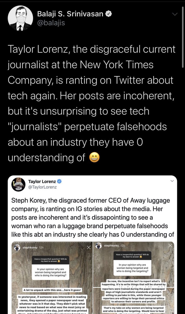 For those that want context of this brouhaha. this thread by @jdotarnold is the most balanced and concise I have seen. https://www.quora.com/What-is-the-July-2020-Twitter-spat-between-Taylor-Lorenz-and-Balaji-S-Srinivasan-really-about/answer/Jeremy-Arnold-4 … PS: While @TaylorLorenz may have legitimate gripes, that screen capture removing context hasn't done her any credibility favors #End