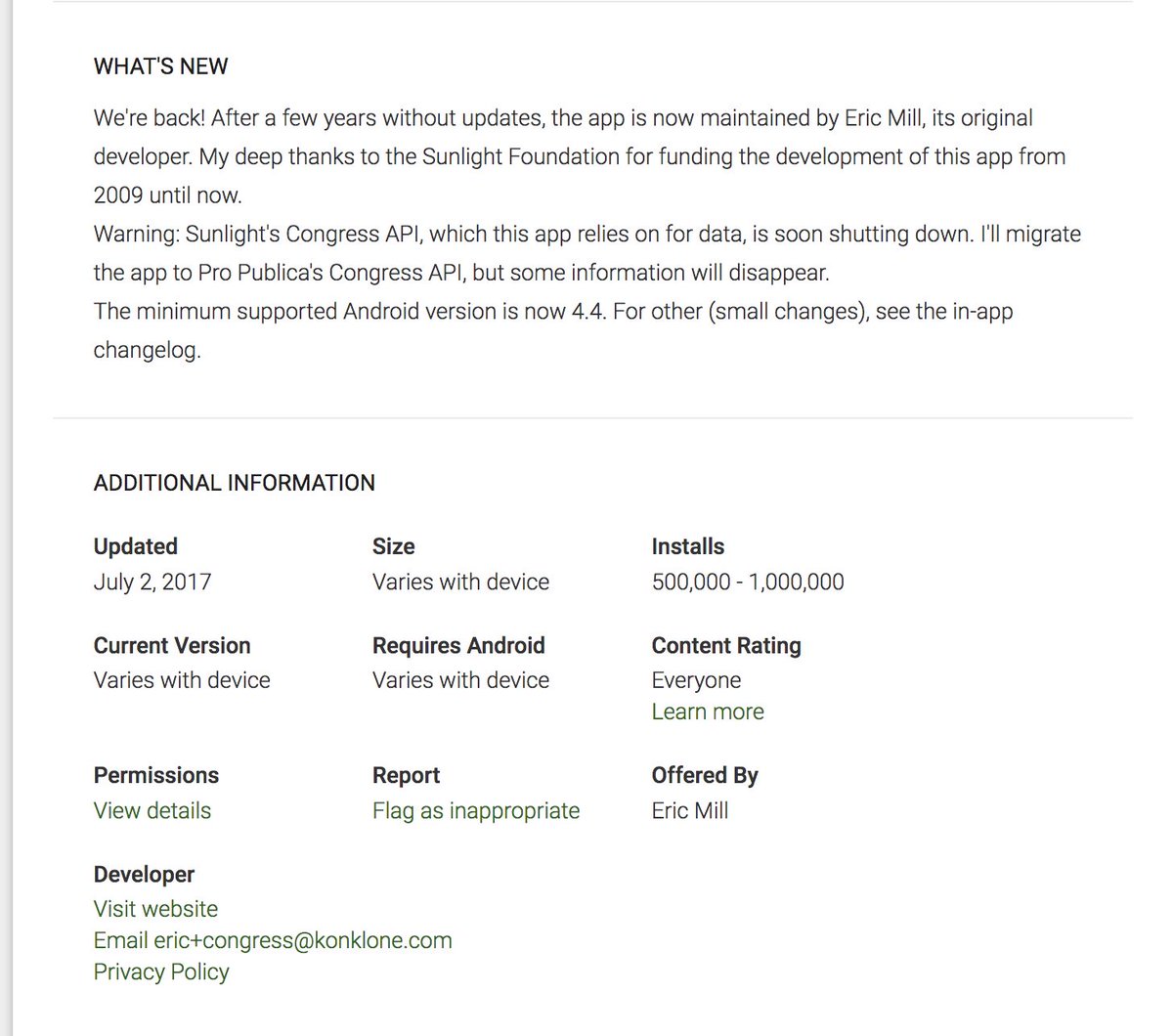 @Android is back!@konklone, the original developer, is maintaining it. https://play.google.com/store/apps/details?id=com.sunlightlabs.android.congress …pic.twitter.com/1dASIqP5bs