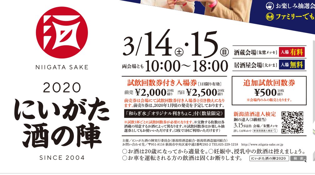 本年度も新潟酒の陣のスケジュールと内容発表されましたね。ただ、試飲チケットが約1枚50円なので酒の陣運営は何も学んでませんね(喜び)pic.twitter.com/eH1fH3SD9a