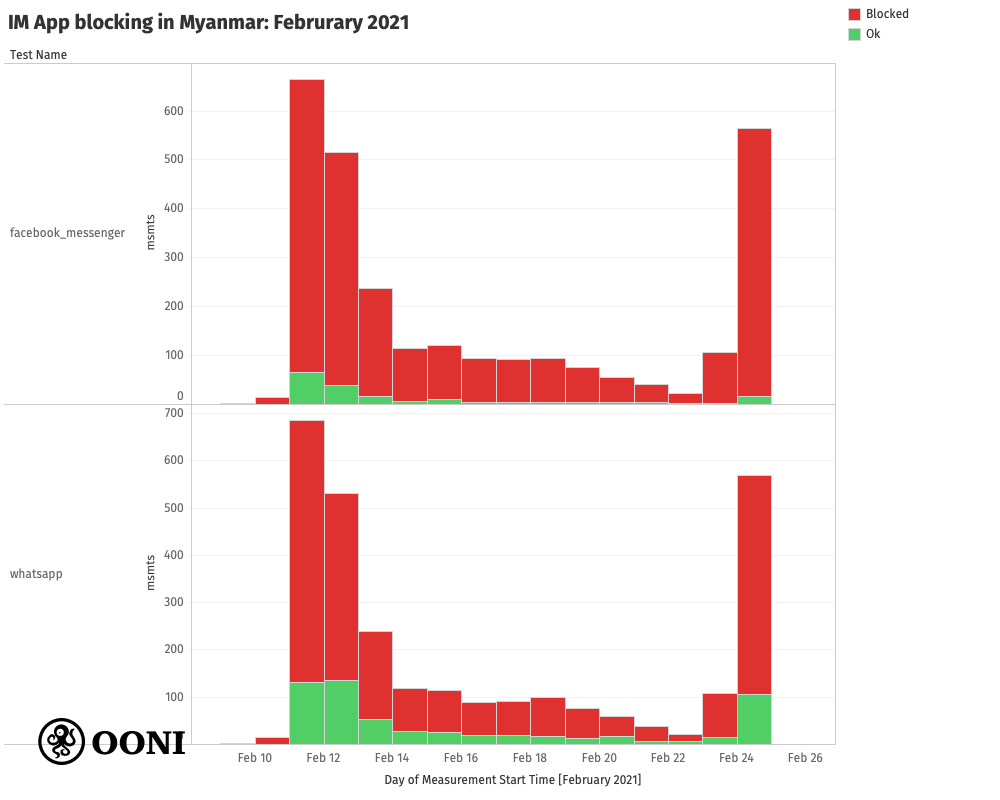 A few days later (early February 2021), OONI data started to show the blocking of social media services (Facebook, WhatsApp, Facebook Messenger, Twitter, Instagram) in #Myanmar. This is ongoing. https://ooni.org/post/2021-myanmar-internet-blocks-and-outages/#blocking-of-social-media … #WhatsHappeningInMyanmarpic.twitter.com/ACwcTxjKbH