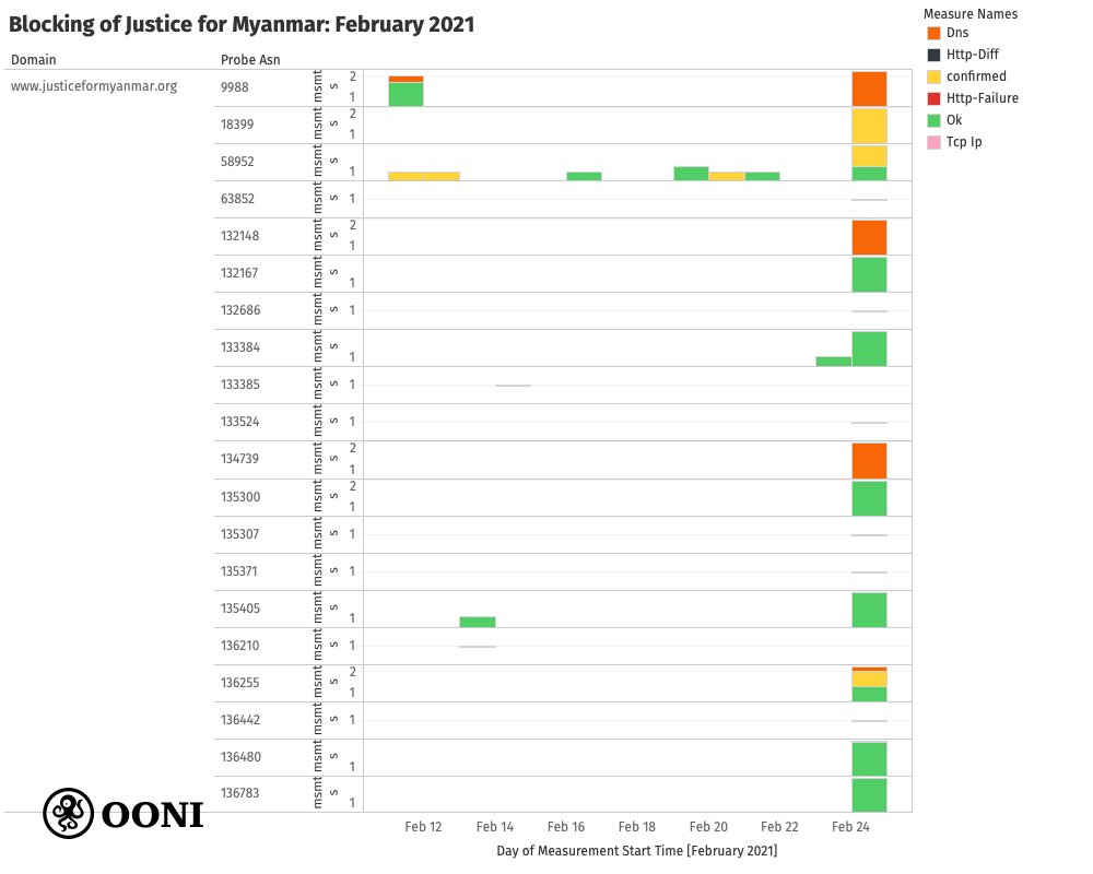 OONI data shows that the site of @JusticeMyanmar (an activist campaign which aims to pressure businesses and investors around the world to divest from Myanmar military businesses) remains blocked in #Myanmar (the blocking was disclosed in August 2020). https://ooni.org/post/2021-myanmar-internet-blocks-and-outages/#justice-for-myanmar …pic.twitter.com/2QdOJaxHuQ