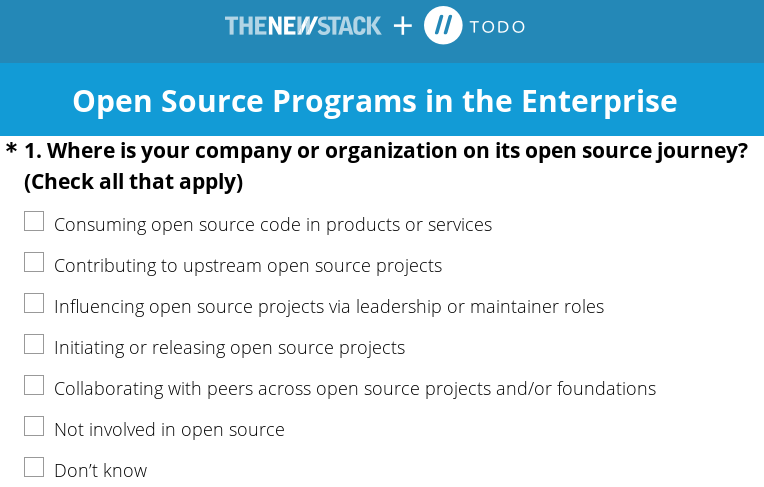 @TheNewStack is conducting a survey with OSI Affiliates @TODOGroup and @LinuxFoundation on the prevalence and outcomes of #OpenSource programs among enterprises across the globe.