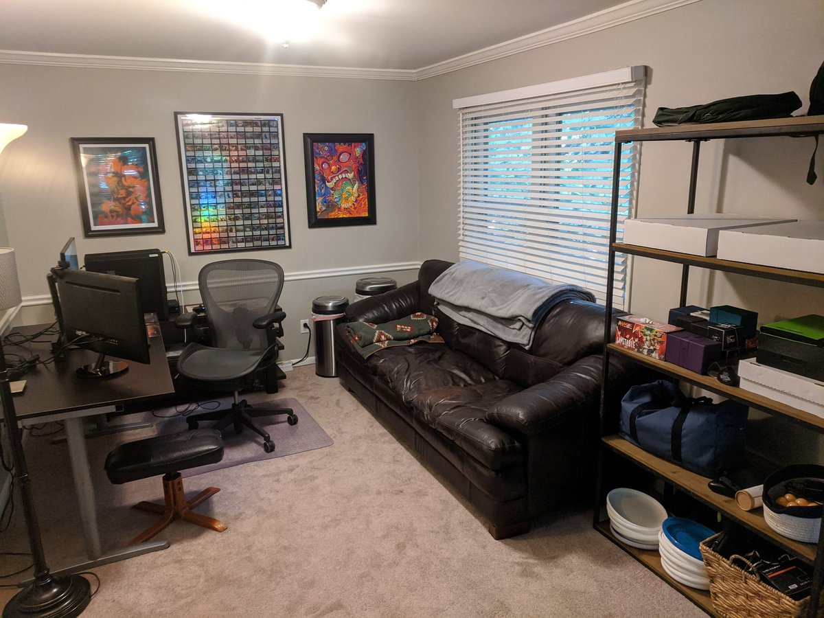 Battle Station finally feeling complete! Procrastinating on hanging the wall art was a big mistake. Shout-out to @TheKrushalator for my favorite piece. +bonus pic of the new pupper on the gaming couch.pic.twitter.com/rFKHJxjZF8