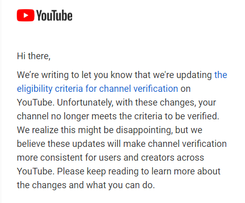 Removing Verification and only selectively giving it out is a very bad idea. Verification was only originally used to prevent fake accounts, to prevent scams. This IS A GOOD THING! By removing it from people, you add in fraud and scams, they will come back. #YouTube pic.twitter.com/P7pEXRT2SQ