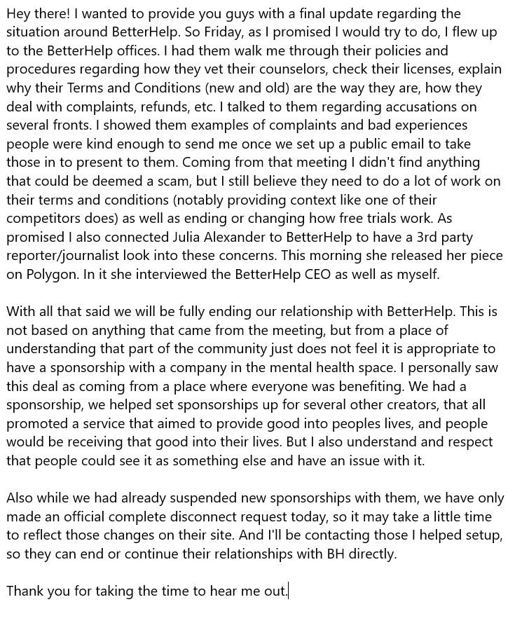 Before posting today's show I wanted to release a final update regarding BetterHelp. Thank you for taking the time to read.pic.twitter.com/GtChLWqF6z