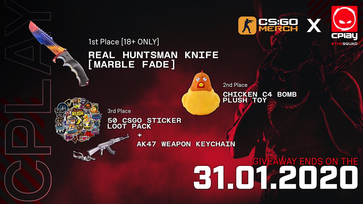 @eSport_ShopDE! Die Jungs haben für euch ein nettes Paket geschnürt. Das Knife ist ein Dekoartikel und 18+, Perso wird am Ende benötigt! Alles was ihr dafür tun müsst ist: Folgt@CPLAYgg &@eSport_ShopDE. Retweetet das Bild. Kommentiert das Ganze mit#CSGOMerch
