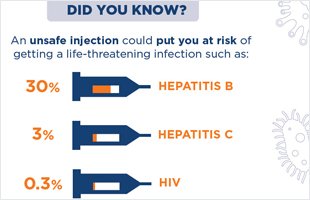 The risk of getting hepatitis B from a contaminated syringe or needle is 30%, 3% for hepatitis C
