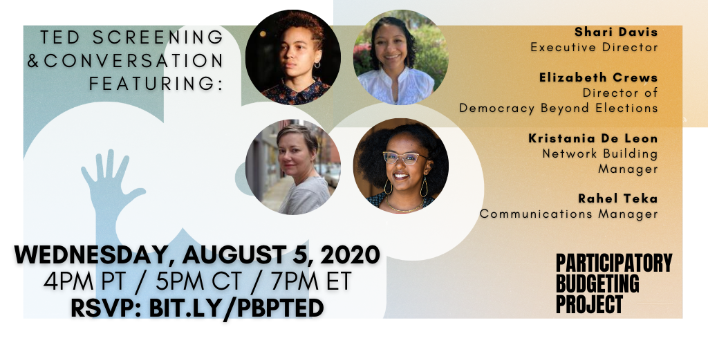 We're less than a couple hours away from our TED talk screening and conversation. Join us and let's re-imagine democracy together! You can join LIVE at 7PM ET / 4PM PT here: https://www.facebook.com/ParticipatoryBudgetingProject/live/ …pic.twitter.com/pVwRKeNy8H
