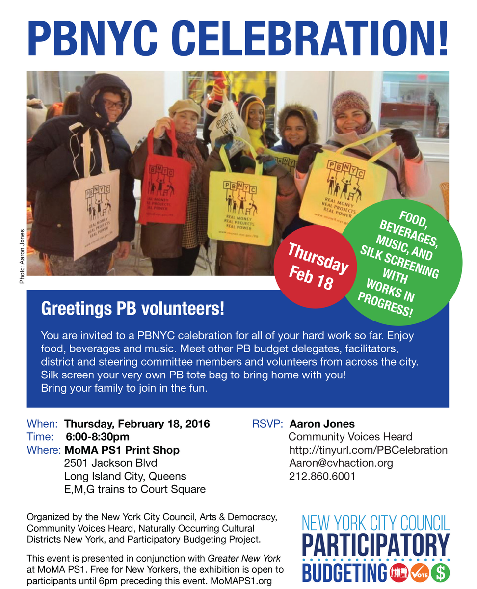 Celebrating PB Volunteers in NYC with a party at PS 1 on Feb 18 - thank you for making democracy work! @PB_NYCpic.twitter.com/WYPLPZbUkS