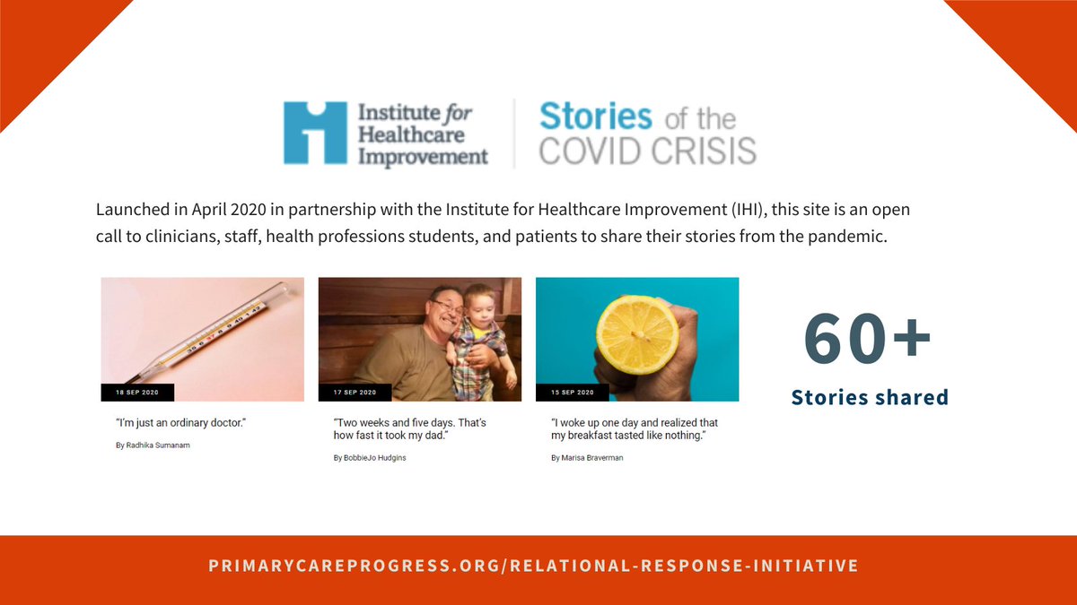 @TheIHI, we launched the Stories of COVID Crisis, a series highlighting pandemic story submissions by clinicians, staff, health professions students, & patients. Visit https://covidstories.ihi.org/ & https://www.primarycareprogress.org/relational-response-initiative/ … for more info.pic.twitter.com/N9od5u3xPR