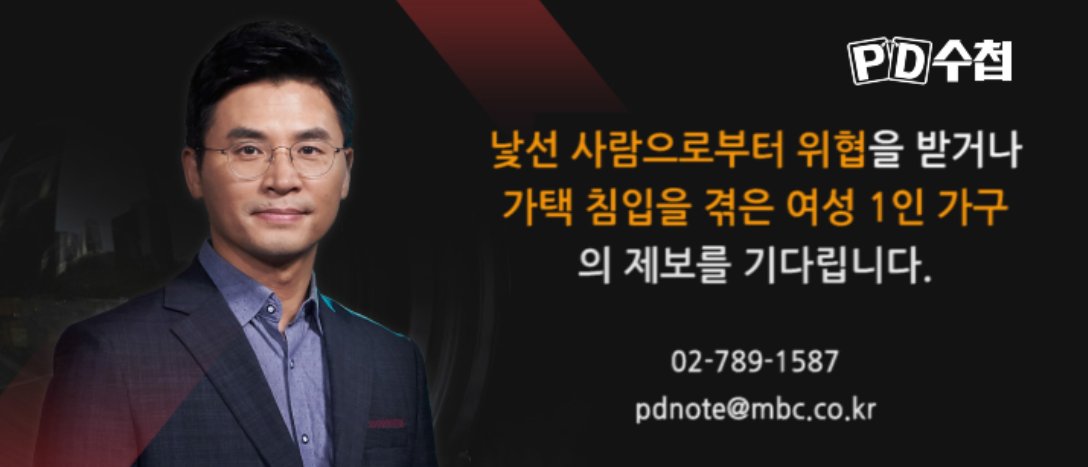 <PD수첩>에서는 낯선 사람으로부터 위협을 받거나 가택 침입을 겪은 여성 1인 가구의 제보를 기다립니다. 02-789-1587 pdnote@mbc.co.kr