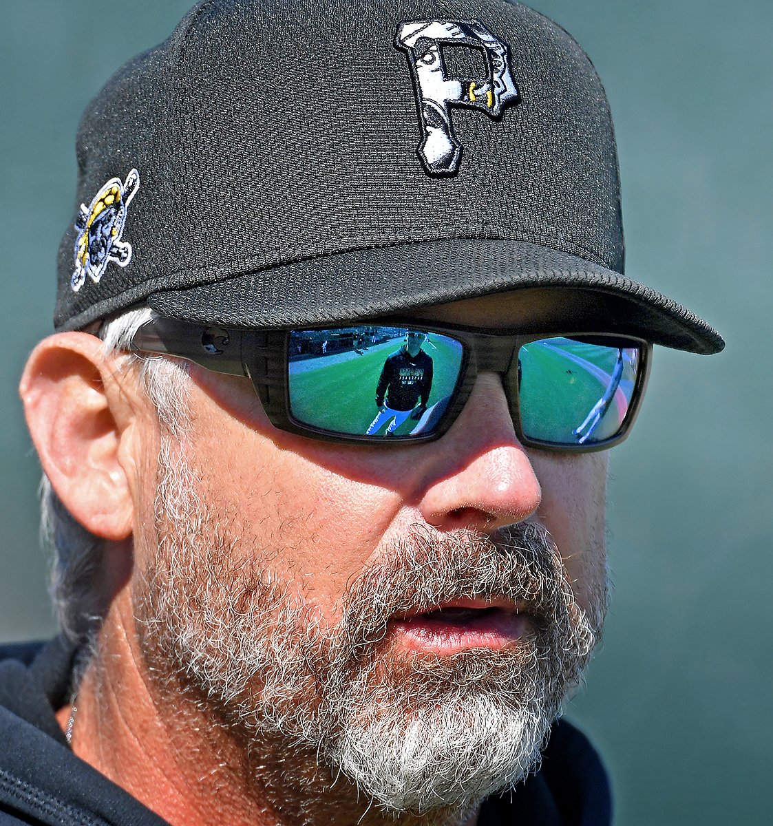 Pirates manager Derek Shelton talks with second baseman Adam Frazier during batting practice Friday at LECOM Park in Bradenton.pic.twitter.com/Fj2E5CPunM