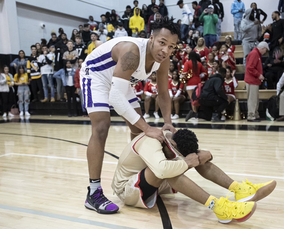 Obama Academy's Dashon Cruse consoles Penn Hills' Kyree Mitchell after Obama Academy beat Penn Hills 73-63 during the first round of PIAA playoffs on Friday, March 6, 2020, at Brashear High School in Beechview. (Steph Chambers/Post-Gazette)pic.twitter.com/6m4EJhjFWy