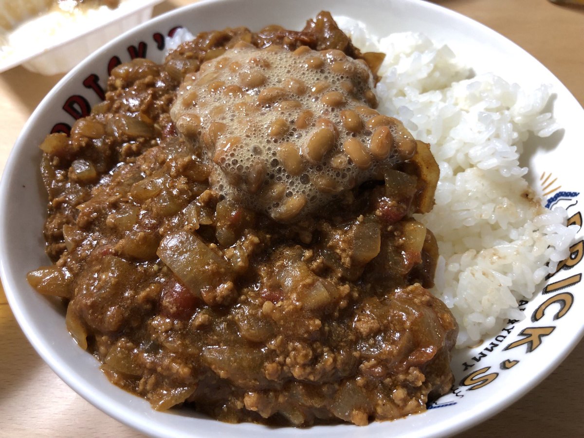 お昼ご飯にアツヒロ特製のキーマカレーをいただく。 オススメの納豆乗せをやってみたけど美味しかった。 昨夜から作ってたらしい。 ご馳走さま!(いつも)pic.twitter.com/QFcCWXc49x