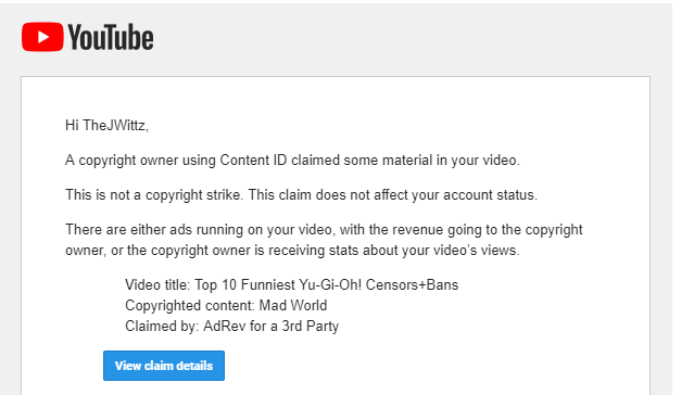 Absolutely insane that using less than 10 seconds of audio from a song on YouTube can let them monetize your entire project. I totally understand that length of audio doesn't matter for copyright law, but dang. I used the audio replacement tool and hopefully that works ASAP.pic.twitter.com/I5m5OyebT4