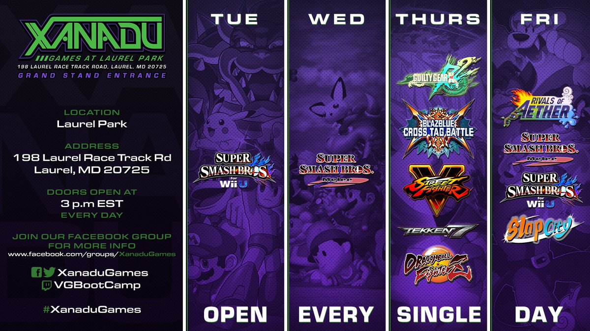 Here's a look at everything at Xanadu Games this week! Monday: Free Play Tuesday: Smash 4 Tournament Wednesday: Melee Tournament Thursday: FGC Night Friday: Free Play Saturday: Bread n Butter 4 Sunday: Free Play For more info, join us on Facebook http://facebook.com/groups/XanaduGames/ …pic.twitter.com/8VOqw4zlpU
