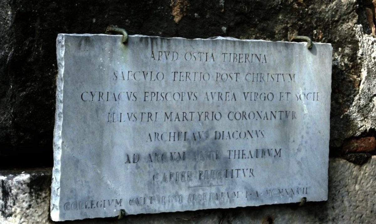 Epigrafe per i Martiri Ciriaco e Aurea del Collegium Cultorum Martyrum del 1927 ad Ostia Antica-Roma APUD OSTIA TIBERINA SAECULO TERTIO POST CHRISTUM CYRIACUS EPISCOPUS AUREA VIRGO ET SOCII ILLUSTRI MARTYRIO CORONATUR ARCHELAUS DIACONUS AD ARCUM ANTE THEATRUM CAPITE PLECTITURpic.twitter.com/79k5e4UH7S