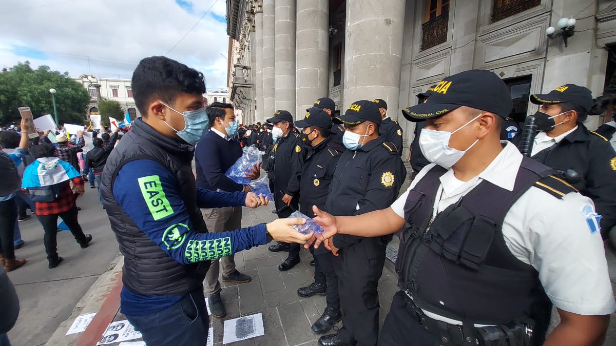 Durante las manifestaciones que se realizan por diferentes sectores en Quetzaltenango de manera pacífica, vecinos de esa área, saludan a efectivos policiales que resguardan el edifico Municipal ubicado en la zona 1, a quienes les brindan agua pura a cada uno de los agentes de PNCpic.twitter.com/vZTGxoxMkP