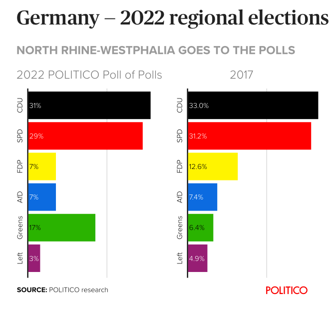 The German state of North Rhine-Westphalia is holding its regional election this Sunday. The conservative Christian Democratic Party, currently leading the state, are in close competition with the opposition Social Democratic Party, which lags only 2 percentage points behind.pic.twitter.com/FyGweZxguu