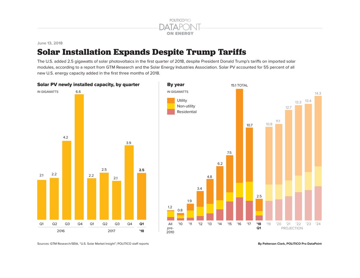 Solar installations expanded in the first quarter of 2018, despite Trump's tariffs. Check out @PattersonClark's DataPoint graphic here: http://bit.ly/2t4bc3a pic.twitter.com/kPiz1WYxil