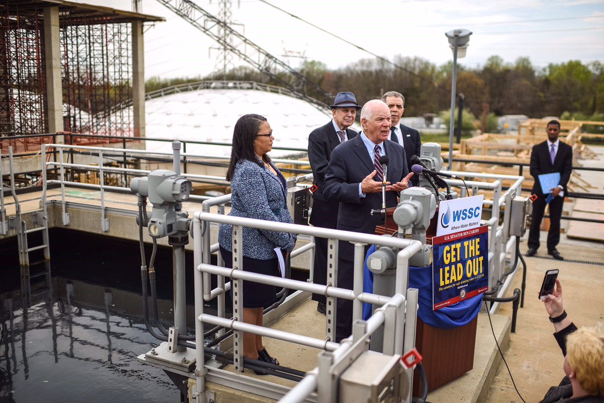 .@SenatorCardin speaks after touring the WSSC's Patuxent Water Filtration Plant in Laurel, Md. | Photo: @jnshinklepic.twitter.com/GTOMRz1GgB