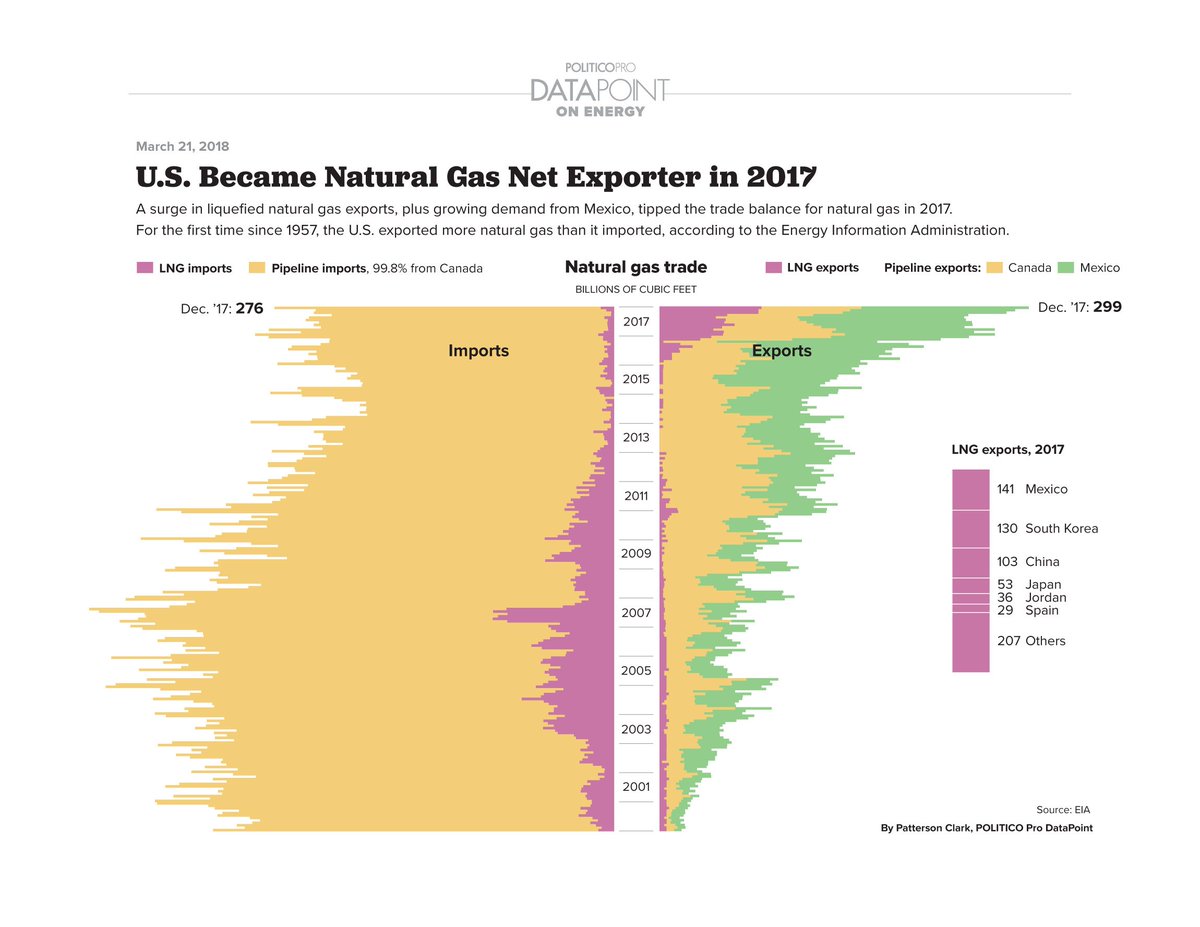 For the first time since 1957, the U.S. exported more natural gas in 2017 than it imported, according to the Energy Information Administration. Pro DataPoint’s @PattersonClark reports:pic.twitter.com/CHFWTPxSWB