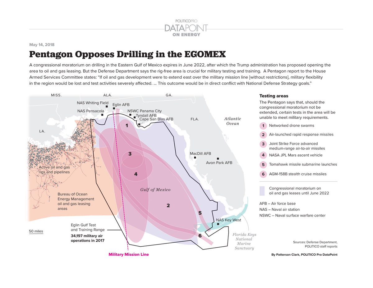 A congressional moratorium on drilling in the Eastern Gulf of Mexico expires in June 2022, but the DoD says the rig-free area is crucial for military testing and training. Graphic from Pro Datapoint's @PattersonClark: https://bit.ly/2rHcTUx pic.twitter.com/HfsBEXKlIp
