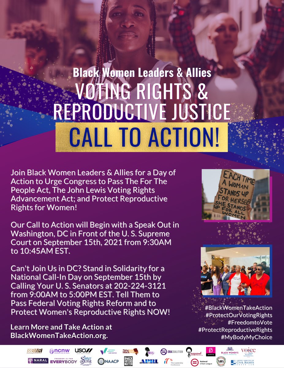 #freedomtovote and reproductive justice! Join us by urging Congress to pass the#JohnLewisVotingRightsAct and protect reproductive rights NOW! Call your U. S. Senator TODAY at (202) 224-3121!#BlackWomenTakeActionpic.twitter.com/OH2R0PzO0x