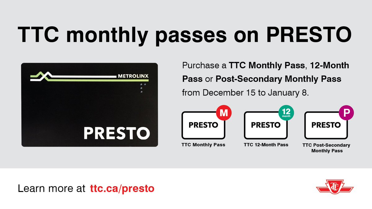 #TTC Monthly Pass on@PRESTOcard from Dec 15 to Jan 8. Passes are available at Fare Vending Machines at subway stations, from Shoppers Drug Mart locations, online at http://prestocard.ca and at the TTC’s Customer Service Centre.pic.twitter.com/zSuLnJqJxt