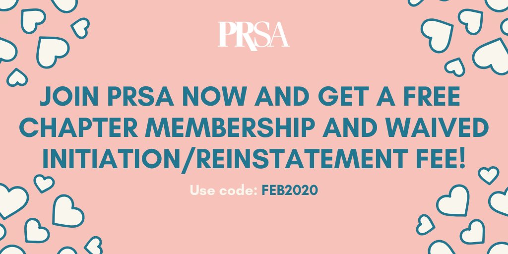 Don’t miss out! Join PRSA with code FEB2020 to get a FREE 1-year Chapter (up to $100 value) and your initiation/reinstatement fee will be waived (up to $65 value). Some restrictions apply. Act now, join PRSA today>> https://bit.ly/2EZLYeY pic.twitter.com/LQihJ4vv9X