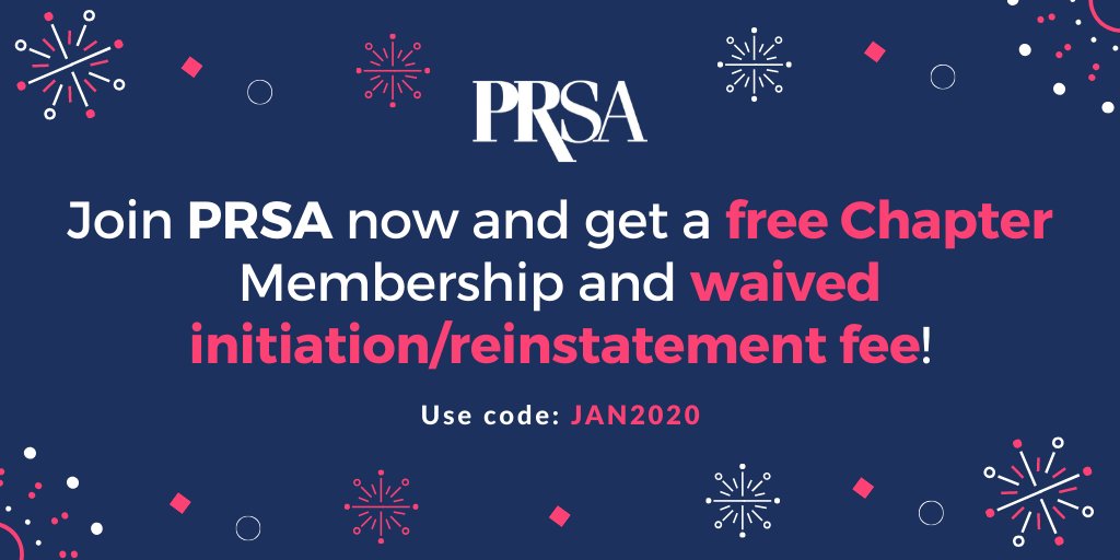 Join PRSA and use code JAN2020 to get a FREE 1-year Chapter (up to $100 value) and get the initiation/reinstatement fee waived (up to $65 value). Some restrictions apply. Set yourself up for success this year and become a member today>> https://bit.ly/2EZLYeY pic.twitter.com/OUYzkDG7Ci