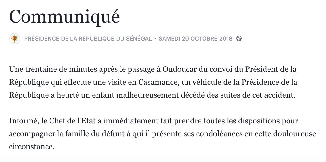 Ce communiqué tente visiblement de mettre hors de cause le "convoi" présidentiel dans l'accident mortel. En cela, il déshumanise la victime, sans nom, sans âge. Il n'y est même pas question d'ouverture de l'enquête devant éclaircir les circonstances de décès de "un enfant".