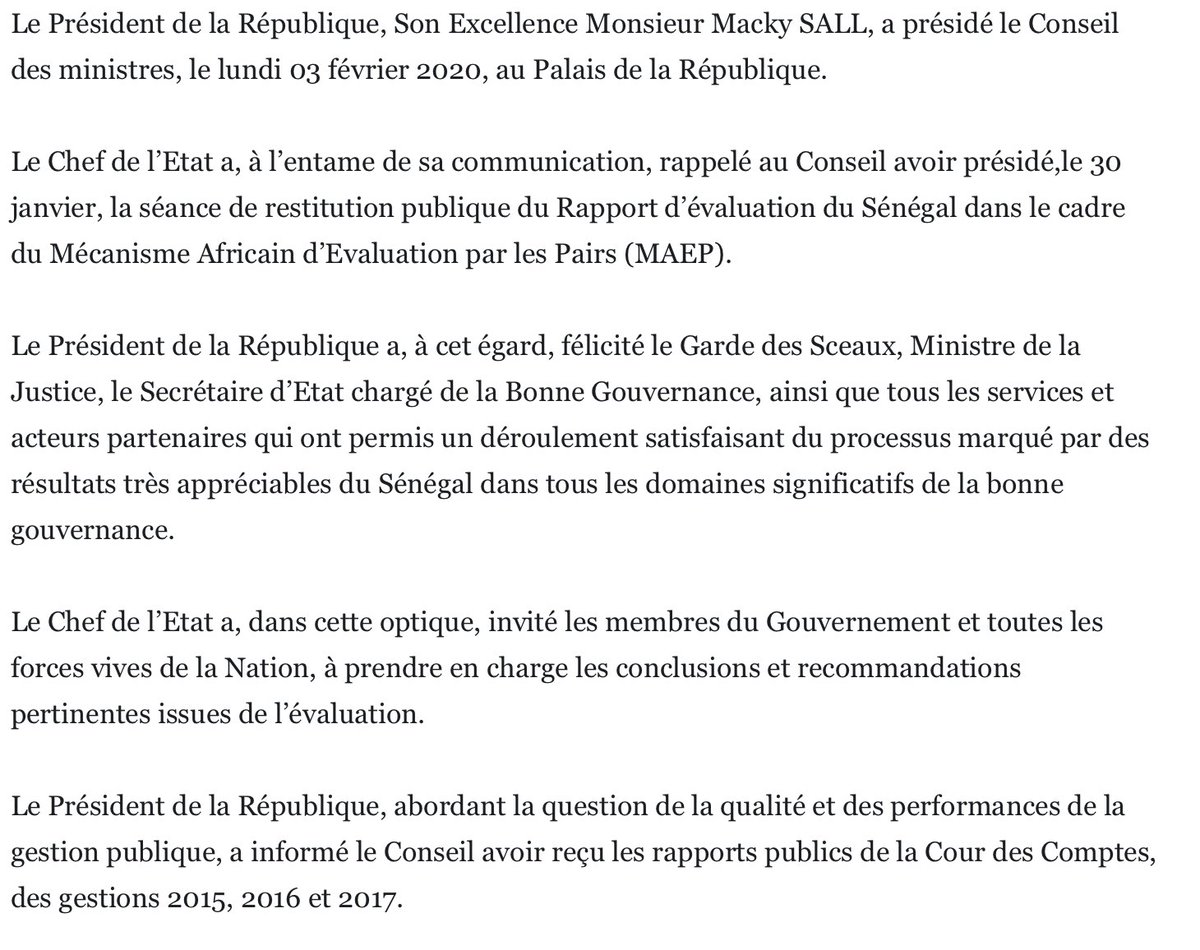 Le communiqué du conseil des ministres de ce lundi 3 février 2020 👇🏾 https://bit.ly/398pmnt pic.twitter.com/qdmk4OYrka