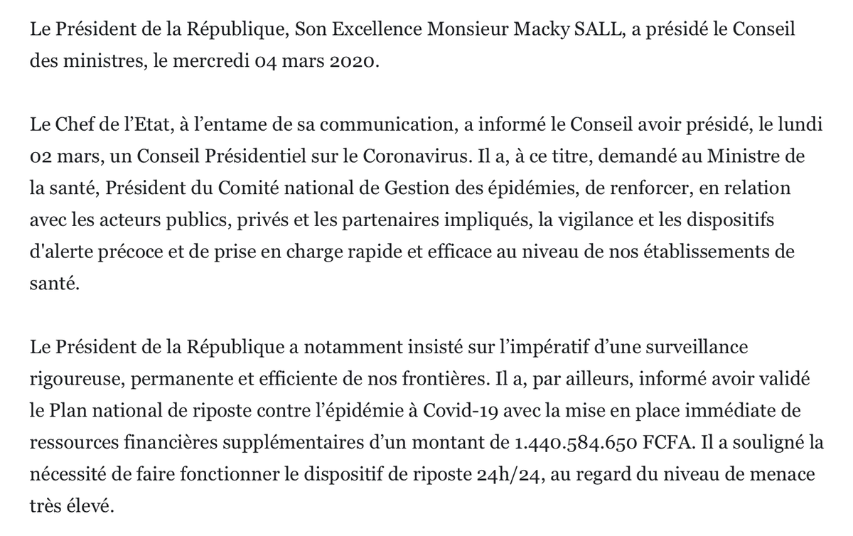 Communiqué du conseil des ministres de ce mercredi 04 mars 2020