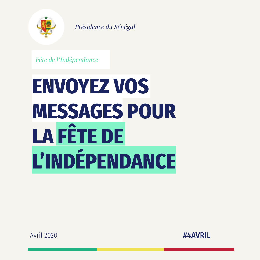 Le traditionnel défilé militaire du 4 avril n'aura pas lieu cette année, mais nous vous invitons à vous filmer et à nous envoyer vos messages de bons vœux pour célébrer la fête nationale. 👉🏿Faites-nous parvenir vos messages vidéos à l'adresse digital@presidence.sn 🇸🇳pic.twitter.com/wCddQktYW3