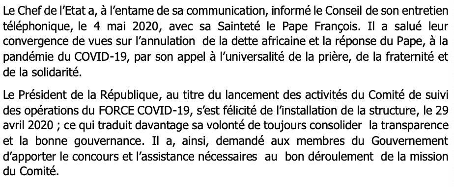 Merci excellence pour la diligence exprimée sur les mesures d’accompagnement en cette période de crise et les nominations