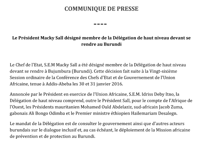 COMMUNIQUE- @macky_sall désigné membre de la Délégation de haut niveau au #Burundi pour "consulter le gouvernement"pic.twitter.com/GfyQwaioOk