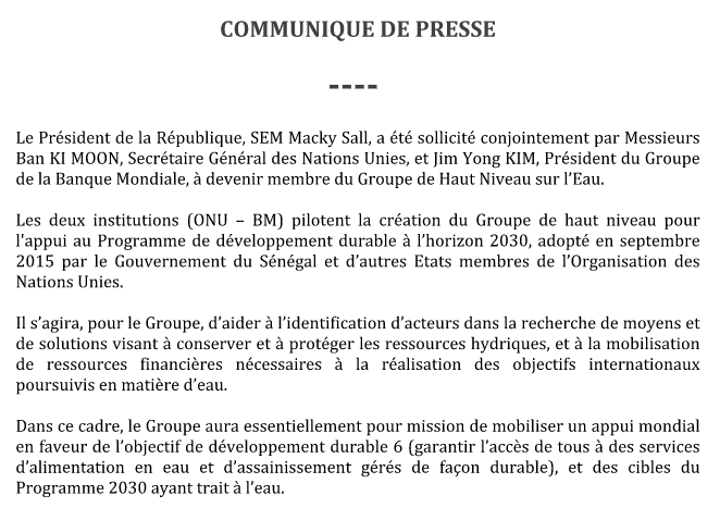 [COMMUNIQUÉ] Ban Ki Moon et @JimKim_WBG invitent @Macky_Sall à devenir membre du Groupe de Haut Niveau sur l’Eau 💧🌍pic.twitter.com/GMfsF90Wop