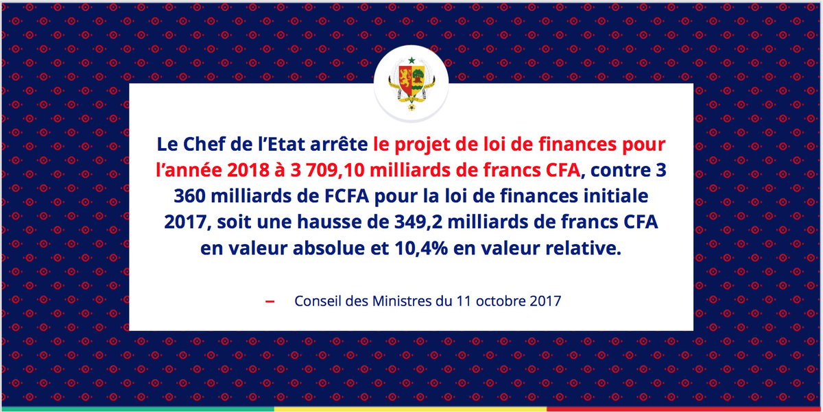 // Projet de loi de finances pour 2018 à 3 709,10 milliards CFA// Extrait du conseil des Ministres👉 http://bit.ly/2gz4xbO pic.twitter.com/4Be8TpxqZr