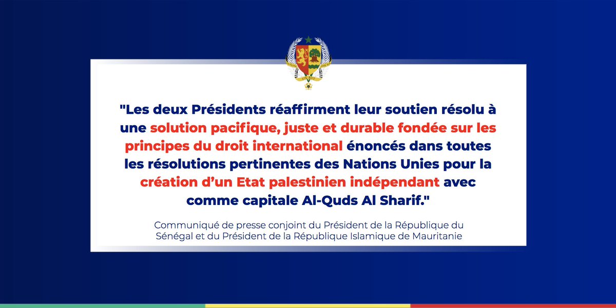 / Soutien à une solution pacifique pour la création d'un Etat palestinien indépendant / Communiqué de presse conjoint du Président de la République du Sénégal et du Président de la République Islamique de Mauritanie : http://bit.ly/2G2Efcr pic.twitter.com/u7ACK55GOy