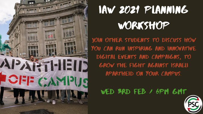 Don't miss this workshop to hear from the PSC Youth & Student Committee on how you can run inspiring and innovative digital events and campaigns, to grow the fight against Israeli apartheid on your campus for Israeli Apartheid Week & beyond! Register now: http://bit.ly/IAWPlanning pic.twitter.com/mmRViXxjBg