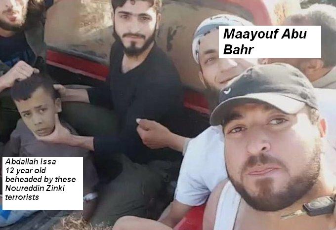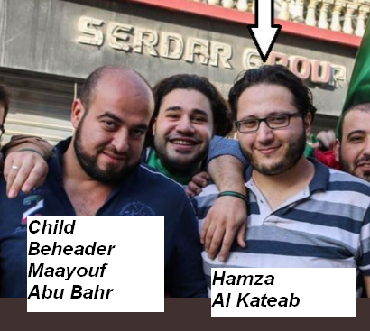 Photo 1: Hamza Al Kateab wearing a tuxedo at BAFTA where his wife won an award for her propaganda film Photo 2: Hamza with child beheader Maayouf Abu Bahr Photo 3: Hamza again with Maayouf Photo 4: Maayouf & Friends before they beheaded 12 yr old Abdallah Issa
