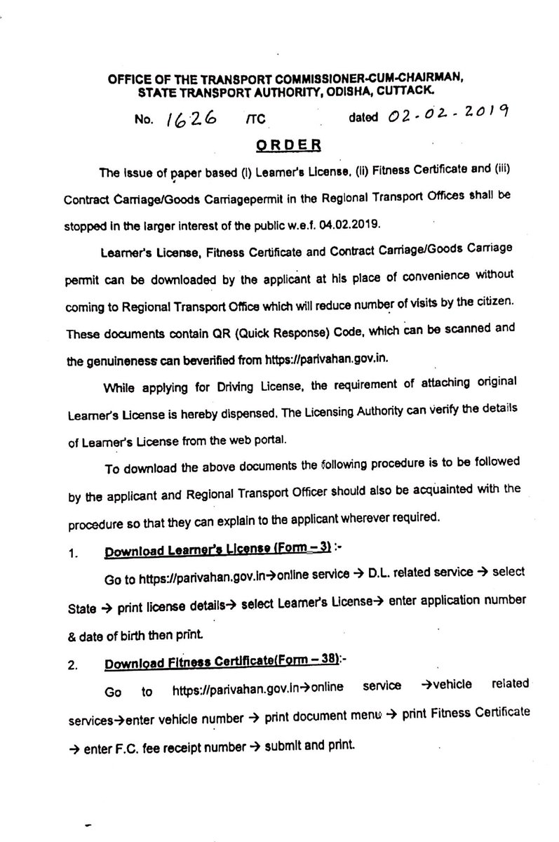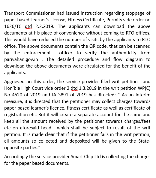 Transport Commissioner had issued instruction on discontinuance of paper based document for LL, FC etc. Hon'ble High Court has given order in WPC 4520 of 2019 filed by service provider SCL that it will collect paper document charges and and keep it in a separate account.pic.twitter.com/qlG7wbsiXG