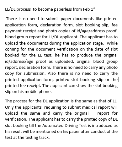 LL/DL process to be paperless from Feb 1st: There is no need to submit paper documents like printed application form, declaration form, slot booking slip, fee payment receipt and photo copies of id/age/address proof, blood group report for LL/DL applicant.
