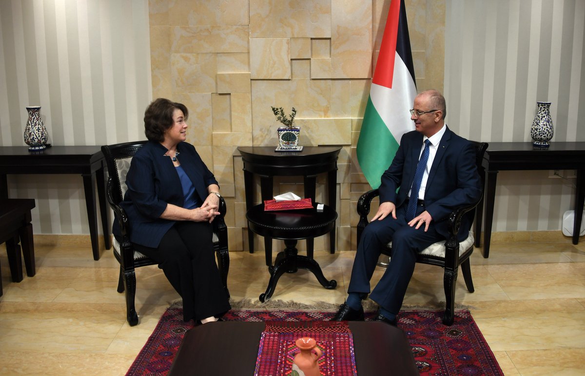 The Prime Minister @RamiHamdalla received today, at his office in #Ramallah, the Executive Director of the American Carter Center, Mary Ann Peters, with the presence of President Abbas Advisor for Foreign Affairs Dr. Nabil Shaath.