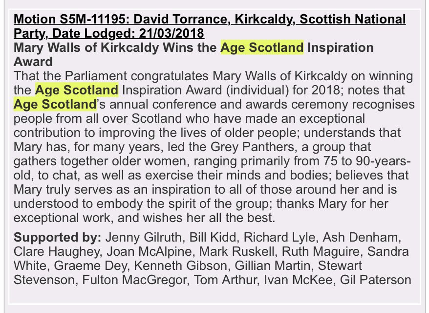 @DavidHTorrance for this motion in@ScotParl congratulating Mary Walls of Kirkcaldy on winning the Inspirational Individual Award at the#AgeScotAwards and for recognising the exceptional work Mary has done with local group the Grey Panthers.pic.twitter.com/9PiWoU9YAP